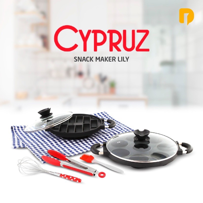 Cypruz Snack Maker Lotus: Cetakan 7 Lubang dan DonatCake Maker Pan untuk membuat aneka sajian, snack sehat bagi keluarga.Terdiri dari:- 1 pc Cake Pan dengan 7 lubang + Tutup Kaca - 1 pc Cake Pan Donat + Tutup Kaca- 1 pc Capitan Nylon (Warna Random)- 1 pc Pengocok Telur (Warna Random)- 1 pc Kuas Kue (Warna Random)Keunggulan produk:- Material alumunium Die Casting dengan Nonstick Coating- Multiguna, bisa untuk membuat aneka snack seperti martabak mini, telur, pancake, serabi dan kue donat- Dilengkapi penutup kaca untuk memudahkan melihat masakan- Pegangan di sisi pan yang tahan p