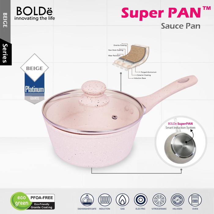 Peralatan masak sauce pan 18 cm dengan penutup kacaTebal panci 3mm ( 2x lipat dari tebal panci merk2 lainnya )Peralatan masak anti lengket berkualitas tinggi dengan coating bahan granit dengan ECO GREEN Technology , Technology yang ramah lingkungan dan tidak mengandung bahan kimia berbahaya.Coating warna beige ( krem )Induction bottom untuk jaminan pemanasan yang merata ke seluruh permukaan.Cocok untuk memasak mie instan, sauce, soup serta masakan lainnya dengan higienis.Kelengkapan :- 1Pcs BOLDe Sauce Pan 18 CM - Beige- FREE BUBBLE