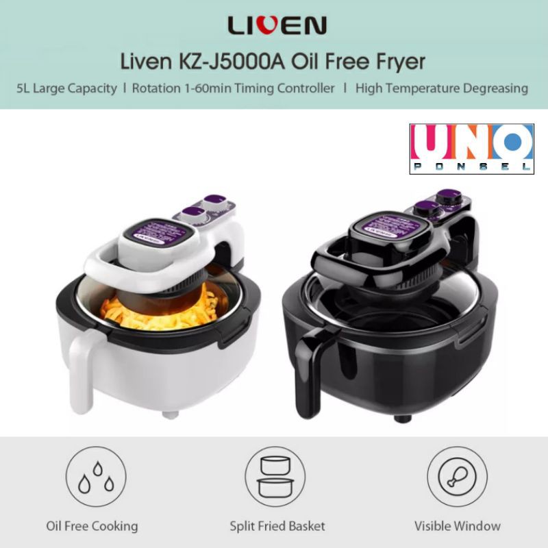 Ready stock,langsung diorder saja gan !!( Produk dijamin 100% Original , jika tidak original makaUang anda akan dikembalikan 100% full amount beserta ongkir )- Produk tidak bergaransi- PACKING 100% AMAN, DOUBLE BUBBLE WRAP- 100% Original-Rotation fan and heating tube at the top circulates heat from top to bottom when cooking.-Protective cover for oil splashing caused by air inflow during the cooking process, so you can cook safely.-Heat-resistant tempered glass for safe cooking, and clear window to check the cooking process from time to time.-High-speed circulation principle of 360 degrees heat air.-Adjustment knob temperature from 90-210 degrees C, time setting knob up to 60 minutes.-Processing a lot of dishes like grilled chicken, kebabs, chips, even items like popcorn or baking.Specifications:Brand: LivenModel: KZ-J5000AWeight: 4.78KGColor: WhiteVoltage: 220V (please confirm whether you can use the voltage or not in your country, thank you)Power: 1100WCapacity: 5LTemperature: 90-210 Dec.CFrequency: 50HzTime limit: 1-60 mi