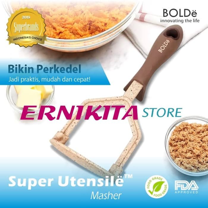 BOLDe Super Utensil Masher Potato - Pelumat / Penghalus Kentang* Tidak bergaransi.* Tambahan kemasan Bubble Packing (GRATIS).* Sebelum dikirim barang pasti diperiksa.* Kerusakan fungsi akibat kelalaian pengguna tidak ditanggung oleh penjual.* Kerusakan fisik akibat pengiriman tidak ditanggung oleh penjual.- Good Quality Utensil Products.- FDA Aprroved.- Food Grade Technology yang ramah lingkungan dan tidak mengandung bahan kimia berbahaya.- Handle dari bahan silikon yg lembut dan mantap digenggam.- BEIGE Color Luxury Design.- Mudah dibersihkan.- Bahan premium nylon.- Super Heat Resistance yang ada di BOLDe Super Utensil ini tahan panas hingga 200 derajat celsius.- Bagian gagang handle dirancang khusus untuk melindungi jari tangan anda supaya tidak terkena wajan yang panas saat digunakan serta nyaman saat digenggam.- Bagian gagang handle BOLDe Super Utensil juga dilengkapi dengan lubang penggantung berbentuk unik, yang memudahkan dalam penyimpanan.- Standing position menjadikan peralatan masak tetap bersih tidak menyentuh langsung permukaan meja dapur.- BOLDe Super Utensil sangat cocok digunakan dengan produk BOLDe Super Pan dan peralatan masak berlapis coating lainnya.Kelengkapan Paket:- 1 Masher Potato BOLDe Super Utensil.Berat paket: 250 grams.PERHATIAN:- Gunakan busa spon lembut saat membersihkan.- Jangan menggunakan tapas karena merusak bahan nylon.- Jangan meletakan utensil di wajan panas dalam waktu lama.- Tahan panas artinya bisa disentuh tetapi tidak terasa panasnya.- Tahan panas bukan berarti bisa dibakar atau tidak meleleh jika dipanaskan dalam waktu lama.- Gunakan utensil untuk mengaduk, membalik atau mencicipi masakan.- Awas lumer! Utensilnya jangan dimasak bersama makanan.Hubungi: ERNIKITA Store | rnikita•com | ernikita•comDistributor Resmi PT. BOLDe INDONESIA - 100% Original Produk Asli BOL