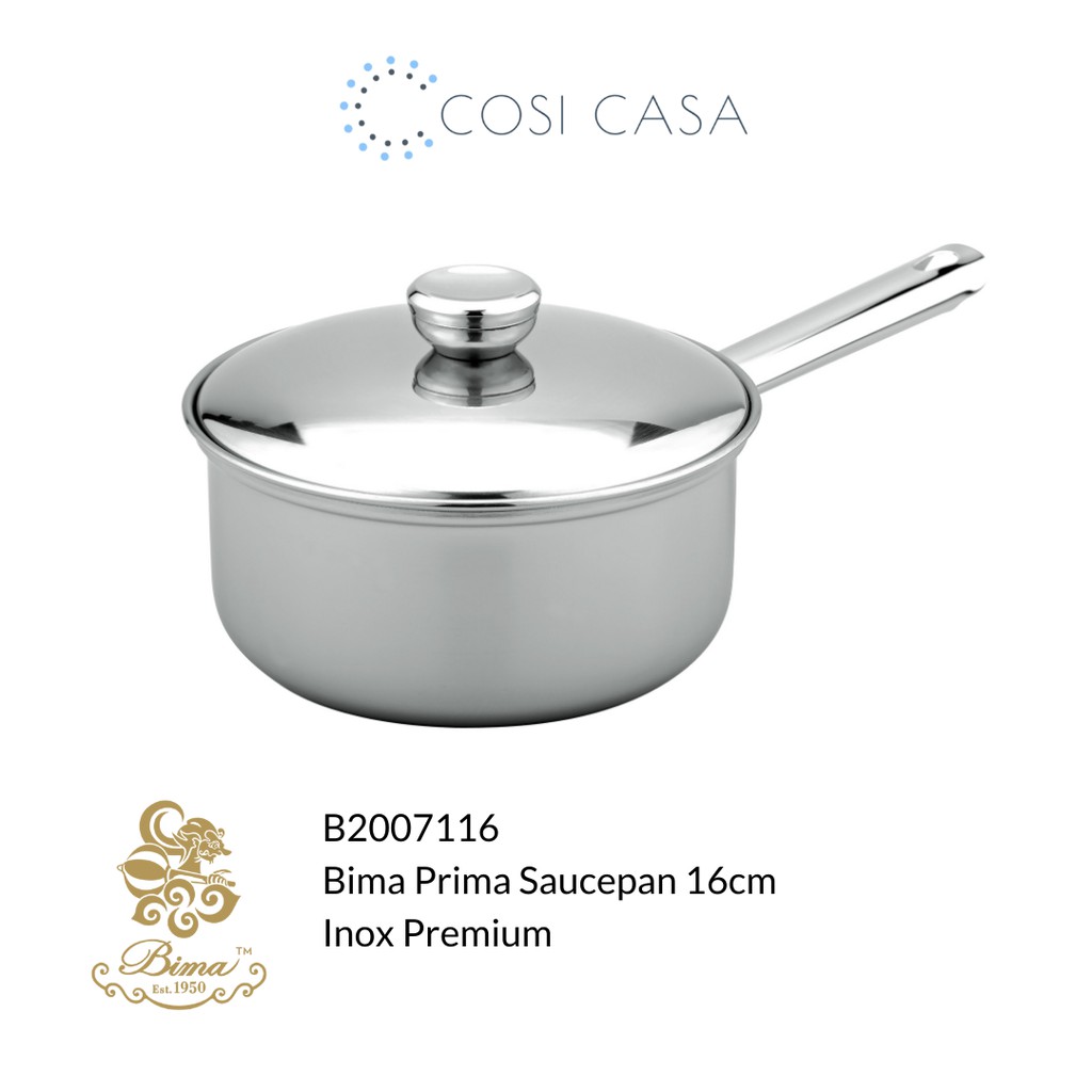 B2007116. Panci Saucepan Bima PRIMA Stainless Steel (S/S) Diameter 16 cm. Dilengkapi dengan tutup S/S. Bahan material panci berkualitas tinggi, tahan lama (awet) dan aman.Dapat digunakan untuk semua sumber panas (Kompor)Sebagai seri berkualitas standard international, Prima dan Prima X1 series menggunakan Premium Stainless Steel Material dan Single-Ply Base, untuk penggunaan masak sehari-hari yang lebih praktis. Untuk memasak masakan yang membutuhkan jangka waktu yang lebih lama.Berdiri sejak tahun 1950, Bima dikenal keunggulannya sebagai pionir produsen peralatan dapur berkualitas prima yang bertaraf international. Pada tahun 1970, Bima menjadi pabrik panci Stainless Steel pertama di Indonesia dan terus berinovasi untuk meningkatkan kualitas dan teknologi. Produk Stainless Steel Bima merupakan produk andalan yang banyak diexport ke berbagai belahan dunia seperti USA, Japan, Europe, South Korea, South Africa, dll. Berpengalaman selama lebih dari 69tahun, dan didukung oleh inovasi teknologi modern, Bima adalah sebuah produk kebanggaan Tanah Air yang menjadi warisan bagi generasi penerus.Temukan barang dapur dan ruang makan berkualitas di toko kami, Cosicasa Liv