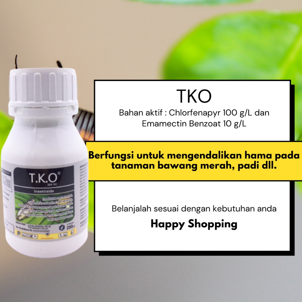 T.K.O 250ml Pembasmi Hama Ulat.Insektisida racun kontak, sistemik translaminar dan lambung berbentuk pekatan yg dapat disuspensikan dalam air, berwarna putih kecoklat-coklatan berdaya kerja luas untuk mengendalikan hama pada tanaman. Berfungsi untuk mengendalikan hama pada tanaman bawang merah, padi dll.Bahan aktif :Lamda sihalotrin 100 g/lTiametoksam 200 g/lKemasan 250mlHARI KERJA SENIN - S