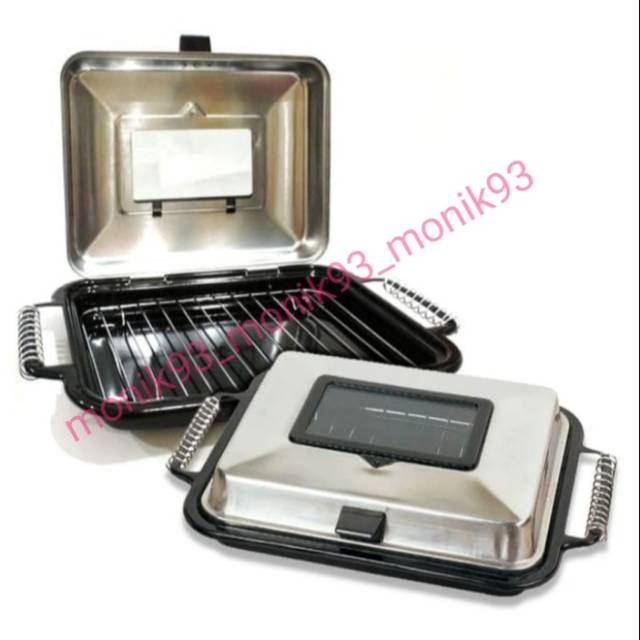 Alat panggang Crystal Oven merk Maspion. Panggangan ikan dengan tampilan yang elegan, praktis dan mudah digunakan. Panggangan ini terbuat dari bahan enamel berkualitas dengan tutup dilengkapi kaca kecil sehingga Anda dapat melihat keadaan bahan yang sedang Anda panggang. Anda dapat bebas memanggang makanan kecil seperti sosis atau makanan dengan ukuran cukup besar seperti ikan, daging steak atau potongan ayam.Ukuran panjang x lebar : 27 cm x