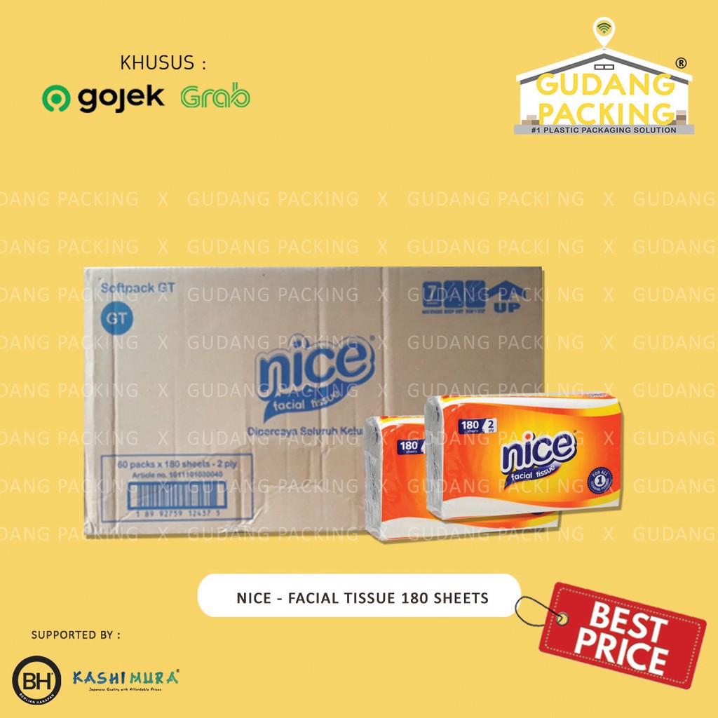 ** Baca dan pahami catatan Toko Gudang Packing® untuk kebaikan bersama, mengirimkan pesanan berarti dianggap menyetujui seluruh ketentuan yang berlaku **Harga untuk 1 Dus (60 pcs).Rekomendasi jasa pengiriman:• Jakarta, Bogor, Depok, Tangerang, dan Bekasi: Gosend/Grab only *Same Day maks 1 dus dan dan Instant maks 3 dus*• TIDAK BISA melalui JNE/ JNT/ Tiki/ Wahana/ Ninja/ Si Cepat/ Anter Aja/ REX/ Pos Indonesia karena akan dikenakan biaya Volume.• Tidak sesuai ketentuan maka akan kami TOLAK/ proses sesuai dengan ketentuan yang berlaku.Spesifikasi produk:• Merk : Nice• Isi : 180 sheets• 1 Dus isi : 60 pak Pembelian 1 Pak, klik>>Tissue Facial Lainnya, klik>>Lokasi pengiriman dari Angke, JakBar. Gudang buka dari hari Senin - Sabtu jam 07:30 - 17:00Batas waktu proses pesanan dan pick up:• Senin - Jumat- Same Day sampai jam 14:00- Instant sampai jam 16:00• Sabtu- Same Day sampai jam 13:00 (sangat beresiko dikirim hari Senin, karena hari Minggu Gudang tutup)- Instant sampai jam 15:00• Minggu dan Tanggal Merah : LIBURJangan ragu! Harga kami sangat bersaing karena kami merupakan Distributor langsung dan utama dari pabrik.Terima k