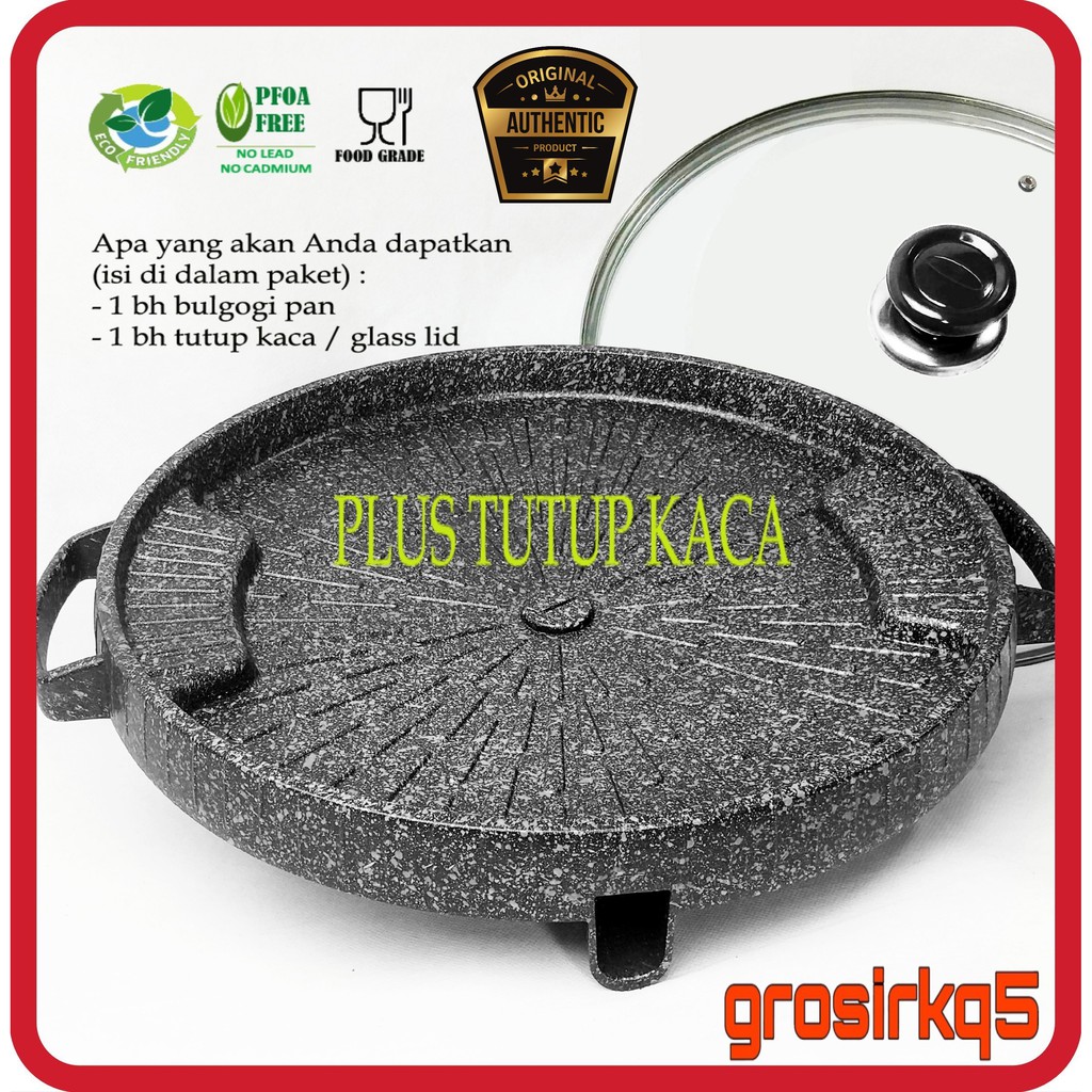 FREE BUBBLE WRAP........ (kami kemas dengan hati-hati, kami packing dengan bubble wrap luar dalam)PRODUK DIJAMIN 100% ORIGINAL. AWAS! BANYAK BARANG PALSU/KW.Bulgogi Grill Pan Diameter 32cm (Korean BBQ)Peralatan memanggang anti lengket dengan bahan aluminium die castYang anda dapatkan (kelengkapan) :- 1 bulgogi marble - 1 tutup kaca tempered glass Feature:1. Marble coating sehingga lebih mudah dibersihkan2. Lapisan anti lengket terbaru 20213. Tahan gores, anti karat dan FOOD GRADE.4. Terdapat lubang di bagian tengah yg dapat dibuka untuk mengeluarkan minyak sisa ke saluran pembuangan5. Disertai dengan TUTUP KACA tempered glass.6. Diameter 32cm----------------------------------Barang yang kami jual adalah WYSIWYG yang artinya adalah : What You See Is What You Get, karena foto yang kami pajang adalah foto asli produk yang akan anda terima, barang kami pastikan asli, baru dan dikirim dalam keadaan utuh dan bagus.Terima k