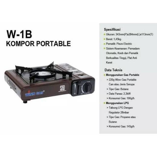 ProdukBaru di Lapak Kami.kami buka dengan harga termurah dengan kualitas yang baik.Silahkan order.Ready stok.Elegan DesignPlat Anti KaratKnob dan Pematik Berkualitas Tinggi2 Fungsi (kaleng dan tabung)Kunci Pengaman2 FungsiPORTABLE GAS STOVE ini bisa digunakan dengan gas kaleng (Butane Gas Cartridge) ataupun gas elpiji (3kg/ 12kg), karena dilengkapi dengan LPG connector.WINN GAS 1B PORTABLE GAS STOVE ini sangat aman dan mudah untuk dibawa traveling bersama keluarga karna dilengkapi dengan tas koper.Cocok untuk di kost, apartemen, acara kuliner, lomba masak, demo masakan, ataupun acara piknikWinn Gas Kompor 1 tungku Gas Kecil Model 1B sangat cocok digunakan untuk anda pecinta petualang atau menyukai travelling keluar kota. Dengan membawa Winn Gas Kompor 1 tungku Gas Kecil Model 1B membuat anda menjadi lebih mudah memasak dimana saja dan kapan saja anda butuhkan.Winn Gas Kompor 1 tungku Gas Kecil Model 1B merupakan kompor gas 1 tungku, kompor gas berkualitas dari Winn Gas. Dengan 1 tungku Anda dapat mengatur besar kecilnya api sesuai kebutuhan memasak Anda.Winn Gas Kompor 1 tungku Gas Kecil Model 1B adalah kompor portable yang sangat cocok digunakan untuk memasak steambot. Bisa juga digunakan pada saat camping ataupun bertamasya karena Winn Gas Kompor 1 tungku Gas Kecil Model 1B sangat mudah dibawa kemana-mana.Data Teknis Pada Suhu 20C+/-5Data Panas : 2,3 kWKonsumsi Gas : 165g/hJenis Catridge : MSF 1AJenis Gas : ButaneJenis Aplikasi Gas : Gas butane bertekanan langsungIsi Kemasan :Winn Gas W-1B Kompor PortableBagDimensi : 34 x 28 x 11 cm1 Tahun Garansi Resmi Win