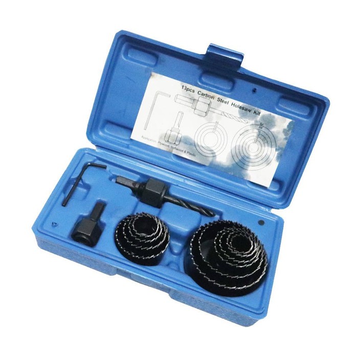 Holesaw Kit 13 Pcs Benz Mata Bor Kayu Set Isi 13 Pcs BENZ WerkzHole Saw Kit Merek BENZKemasan box plastiK Isi 13 pcsKualitas dijamin diatas rata - rata karena berbahan CARBON STEEL1 Pc Big Arbor with twist Drill 6x60mm1 Pc Smal Arbor1 Pc Alley Key 2.5mmHole Saw: 19mm, 22mm, 25mm, 28mm, 32mm, 35mm, 38mm, 44mm, 54mm dan