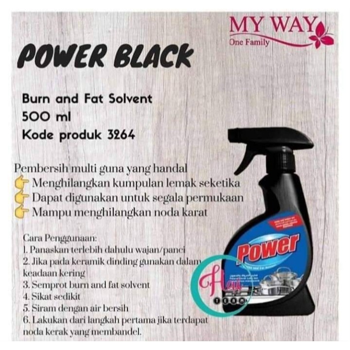 READY STOK LANGSUNG KIRIM power Hitam by My Way yang mampu menghilangkan kerak di panci , Lantai, ataupun barang yang nodanya sulit dibersihkan. Isi 500mlCara penggunaan-Pakai sarung tangan terlebih dahulu-Panaskan panci lalu Semprot Power hitam-tunggu sekitar 5menit- Gsook menggunakan kawat lalu