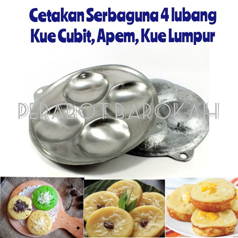 Cetakan Kue - Cetakan Lumpur - Cetakan Pukis - Cetakan Apem - Cetakan Bikang - Cetakan Puyuh - Cetakan Takoyaki cetakan kue cekung isi 4 lubang digunakan untuk membuat berbagai macam kue cemilan seperti apem, kue lumpur, bikang kue cubit, telur mata sapi dan lain-lain...FREE SUTIL...Spesifikasi :- Bahan : aluminium cor- Jumlah Lubang : 4 lubang- Diameter Cetakan : 21 cm - Diameter Lubang : 8 cm- Kedalaman Lubang : 1,5 cm - Tanpa